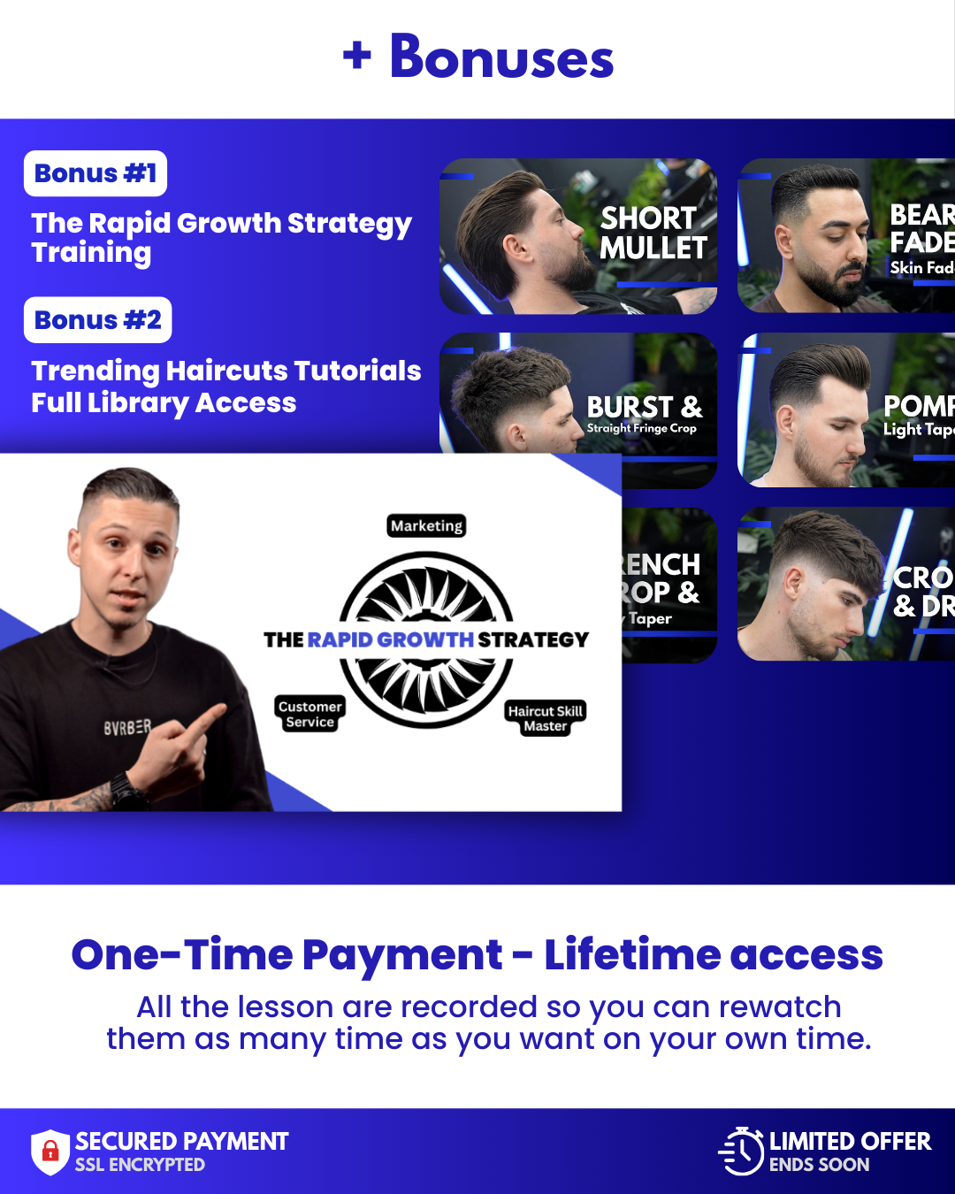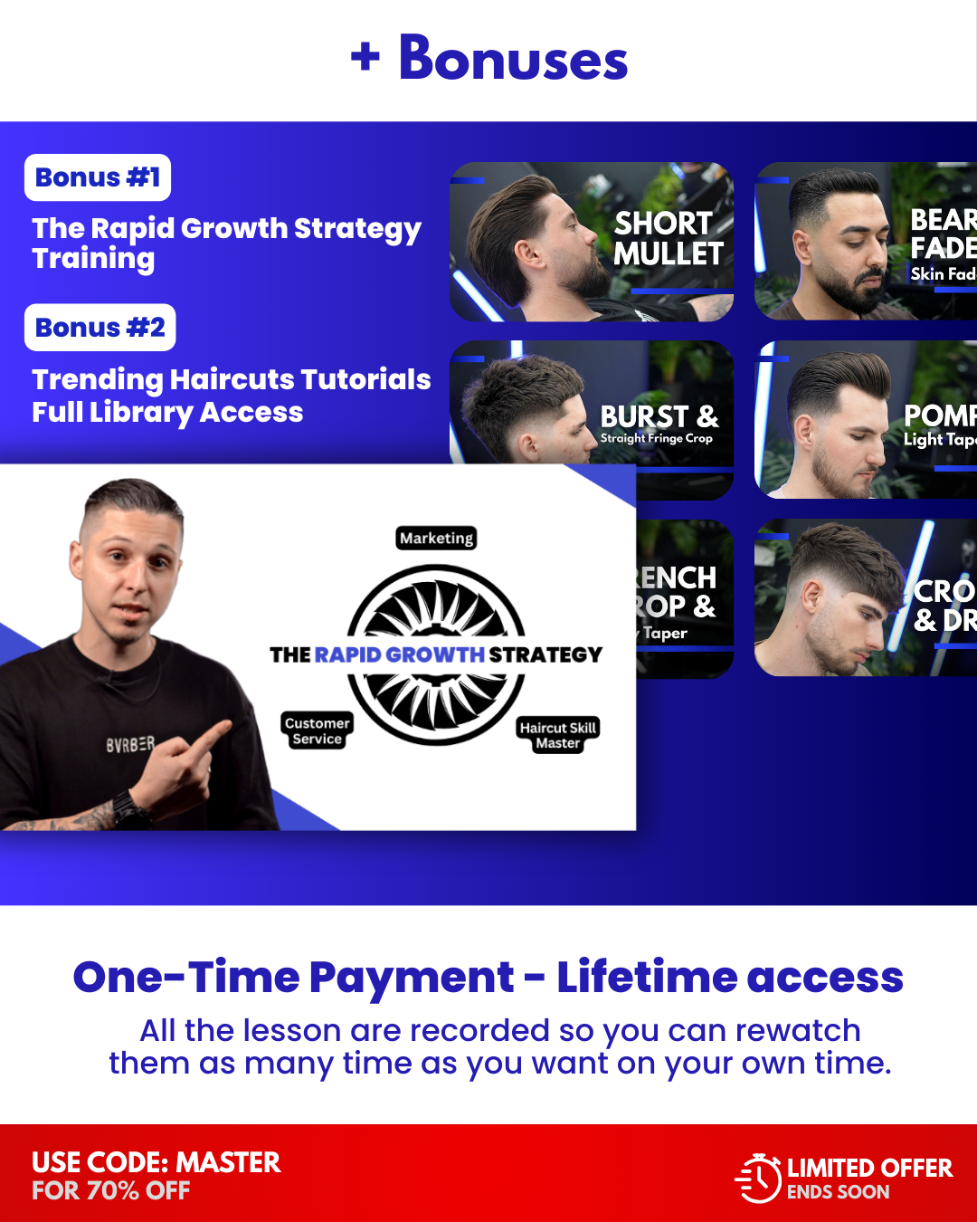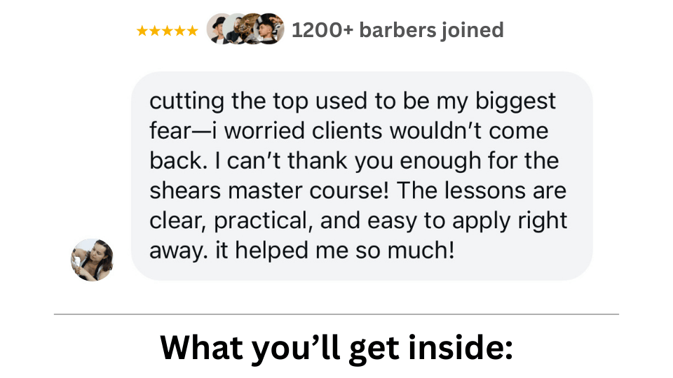 With this upgrade, you’ll get The Fade Master’s entire breakdown of fading techniques, blending sequences, clipper control, guard transitions, and precision detailing… everything you need to become a complete, well-rounded barber.